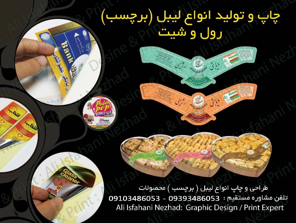 چاپ و طراحی و تولید انواع لیبل (برچسب) رول و شیت ، جعبه متالایز ، کاور محصولات غذایی، دارویی، آرایشی بهداشتی ، لبنی ، صنعتی چاپ انواع لیبل ( استیکر ) پشت چسب دار بصورت رول و شیت لیبل کاغذي، فیلم صدفی ، متالایز، برچسب گارانتي ، ترانسپارانت ( شیشه اي) PVC، PP، PE و برچسب خرد شونده ( گچی )، هولوگرام Label Paper / label Security / label Asset / label Metal / PVC / Transparent / Label Thermal خدمات تکمیلی دایکات تخت ، روتاری و پوشال برداری، اسلیتر، طلاکوب، سلفون کشی رول، و پوشش وارنیش. جهت خدمات به محصولات تولیدات لبنی، آرایش و بهداشتي، دارویی، غذایی، صنعتی، لیبل های ترشیجات، خشکبار، ادویه جات، پروتئین ها، نساجی، لوازم خانگی و خودروسازی و ... چاپ پلات لمینیت – چاپ دیجیتال –سازه های نمایشگاهی (out door – indoor) چاپ پلات لارج فرمت با متریال های فتو گلاسه – کوتد – بک لایت – کانوانس – بوم – بنر – مش – فلکس فیس – لمینیت سرد و گرم – مات و براق – قاب شاسی در سایزهای مختلف با طرح و عکس و ... ، چاپ بک لایت جهت لایت باکس در سایزهای مختلف – انواع سازه های نمایشگاهی استند ، رول آپ ، پاپ آپ ، جا کاتالوکی ، میز کانتر ، سازه های نمایشگاهی پرتابل ، سه پایه بوم ، چاپ و ساخت انواع جعبه و کاور های محصولات لبنی، آرایش و بهداشتی ، دارویی، غذایی، صنعتی و... طراحی و چاپ انواع کاتالوگ ، بروشور ، پوستر ، فلایر، فولدر جیب دار ، کارت پستال ، کارت دعوت ، تقویم رو میزی ، تقویم دیواری ، سر رسید ، پاکت نامه و... طراحی ست اداری ، پاکت ، سربرگ ،کارت ویزیت ،کاغذ یادداشت وفاکتور فروش و اوراق اداری و بهادا طراحی و گرافیگ برند و لوگو، طراحی بسته بندی محصولات غذایی، آرایش و بهداشتی ، دارویی، مشاوره رایگان جهت انجام انواع پروژه چاپی تلفن مستقیم : Ali isfahani nezhad ( کارشناس چاپ - طراح - گرافیست ) 53 60 348 0939 - 53 60 348 0910 ali.isfahani96@gmail.com چاپ رول شیت برچسب استیکر لیبل ترانسپارانت متالایز صدفی pvc گارانتی جعبه کاور بسته بندی غذ