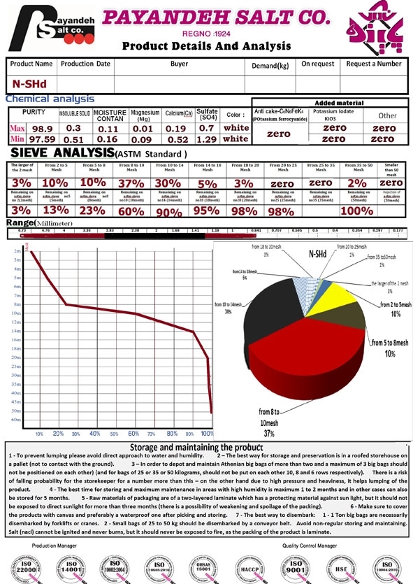 نمک مخصوص این صنعت در شرکت نمک پاینده با مشخصات ذیل پیشنهاد میشود
