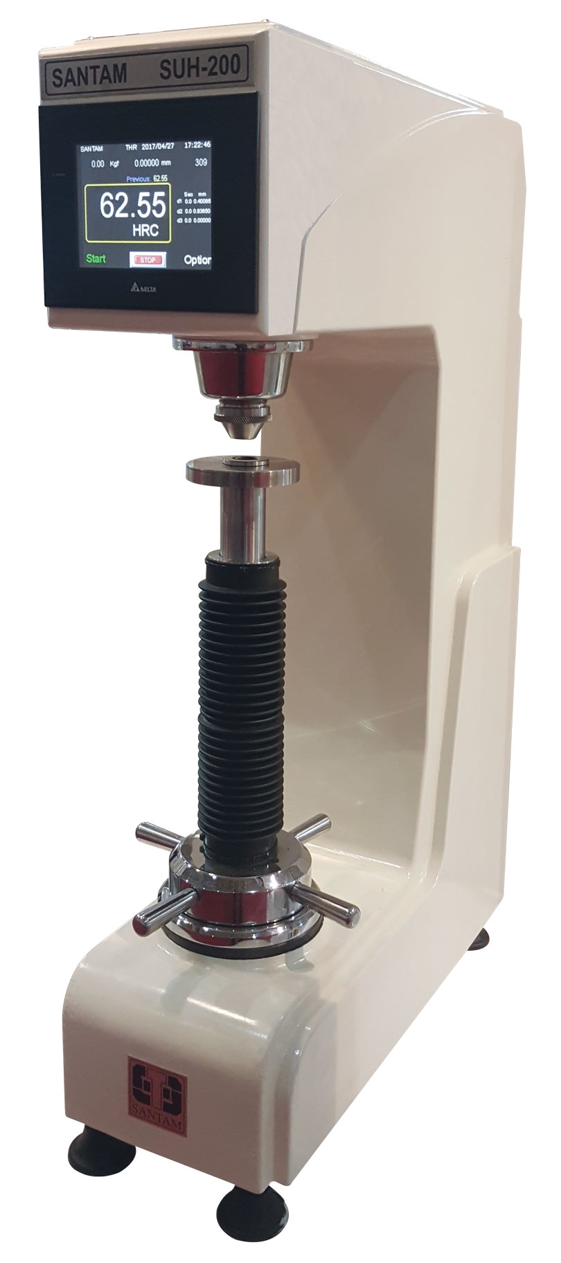 دستگاه سختی سنج SUH-200 توانایی اندازه گیری سختی فلزات به روش راکول بصورت مستقیم و ویکرز، برینل بصورت غیرمستقیم را دارد که در روش مستقیم برای تست راکول عمق نفوذ ایندنتور مستقیما توسط دستگاه اندازه گیری و سختی محاسبه و نمایش داده می شود. در روش غیرمستقیم قطر اثر ایندنتور باید توسط تجهیزات جانبی اندازه گیری شده و سختی مربوطه محاسبه گردد. مکانیزم اعمال نیرو با مکانیزم سروو مکانیکال بسیار دقیق با کنترل پیشرفته و اندازه گیری نیرو توسط لودسل خیلی دقیق انجام شده و دارای انتخاب های گوناگون روش تست بوده بطوریکه برای راکول 15 روش، راکول سوپر فشیال 15 روش، ویکرز 8 روش و برینل 24 روش (تا ظرفیت 200 kgf) قابل تست میباشد. قابلیت نصب انواع ایندنتور های استاندارد برای روش های مختلف سختی سنجی و سندانهای مختلف به منظور نگهداری قطعات مختلف فراهم می باشد. از دیگر توانایی های دستگاه گزارش آماری از آخرین تست های انجام شده بوده و میتوان همه ی پارامترهای تست بر روی نمایشگر دیجیتال لمسی (Touch Screen) را مشاهده و انتخاب کرد. دقت اندازه گیری نیرو بهتر از 0.5 % applied load (و یا 50grf خطای حداکثری) و درجه تفکیک کلی جابجایی ایندنتور دستگاه 0.05 µm می باشد و همینطور مشخصات کورس دستگاه 0 ~ 300 mm و عمق کار گیر تا 200 mm میباشد.