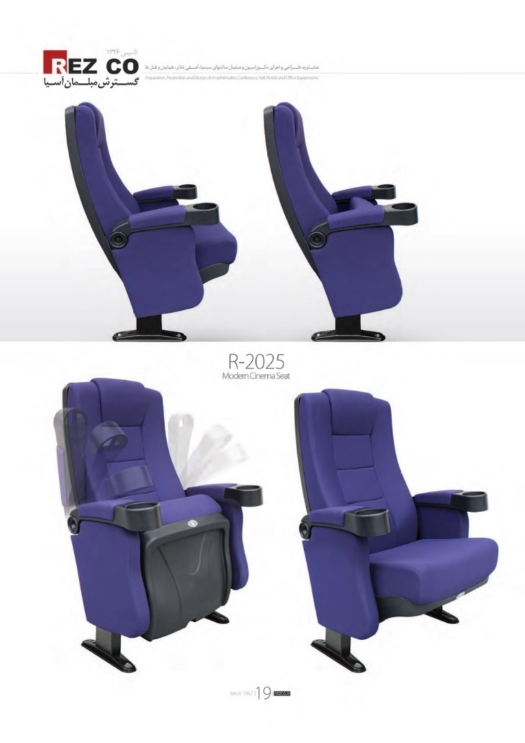 این مدل صندلی هم به صورت صندلی سینمایی وهم به صورت صندلی آمفی تئاتر استفاده میشود و از فوم سرد تهیه شده است .این صندلی آمفی تئاتری به صورت دو پایه بوده و محل نگهداری بطری آب را بر روی دسته صندلی دارد . دراین صندلی آمفی تئاتری دسته قابلیت بلند شدن دارد و کفی صندلی بر میگردد . گروه صنعتی رض کو