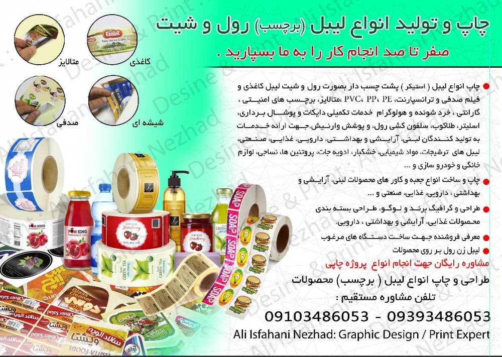 چاپ و طراحی و تولید انواع لیبل (برچسب) رول و شیت ، جعبه متالایز ، کاور محصولات غذایی، دارویی، آرایشی بهداشتی ، لبنی ، صنعتی چاپ انواع لیبل ( استیکر ) پشت چسب دار بصورت رول و شیت لیبل کاغذي، فیلم صدفی ، متالایز، برچسب گارانتي ، ترانسپارانت ( شیشه اي) PVC، PP، PE و برچسب خرد شونده ( گچی )، هولوگرام Label Paper / label Security / label Asset / label Metal / PVC / Transparent / Label Thermal خدمات تکمیلی دایکات تخت ، روتاری و پوشال برداری، اسلیتر، طلاکوب، سلفون کشی رول، و پوشش وارنیش. جهت خدمات به محصولات تولیدات لبنی، آرایش و بهداشتي، دارویی، غذایی، صنعتی، لیبل های ترشیجات، خشکبار، ادویه جات، پروتئین ها، نساجی، لوازم خانگی و خودروسازی و ... چاپ پلات لمینیت – چاپ دیجیتال –سازه های نمایشگاهی (out door – indoor) چاپ پلات لارج فرمت با متریال های فتو گلاسه – کوتد – بک لایت – کانوانس – بوم – بنر – مش – فلکس فیس – لمینیت سرد و گرم – مات و براق – قاب شاسی در سایزهای مختلف با طرح و عکس و ... ، چاپ بک لایت جهت لایت باکس در سایزهای مختلف – انواع سازه های نمایشگاهی استند ، رول آپ ، پاپ آپ ، جا کاتالوکی ، میز کانتر ، سازه های نمایشگاهی پرتابل ، سه پایه بوم ، چاپ و ساخت انواع جعبه و کاور های محصولات لبنی، آرایش و بهداشتی ، دارویی، غذایی، صنعتی و... طراحی و چاپ انواع کاتالوگ ، بروشور ، پوستر ، فلایر، فولدر جیب دار ، کارت پستال ، کارت دعوت ، تقویم رو میزی ، تقویم دیواری ، سر رسید ، پاکت نامه و... طراحی ست اداری ، پاکت ، سربرگ ،کارت ویزیت ،کاغذ یادداشت وفاکتور فروش و اوراق اداری و بهادا طراحی و گرافیگ برند و لوگو، طراحی بسته بندی محصولات غذایی، آرایش و بهداشتی ، دارویی، مشاوره رایگان جهت انجام انواع پروژه چاپی تلفن مستقیم : Ali isfahani nezhad ( کارشناس چاپ - طراح - گرافیست ) 53 60 348 0939 - 53 60 348 0910 ali.isfahani96@gmail.com چاپ رول شیت برچسب استیکر لیبل ترانسپارانت متالایز صدفی pvc گارانتی جعبه کاور بسته بندی غذ