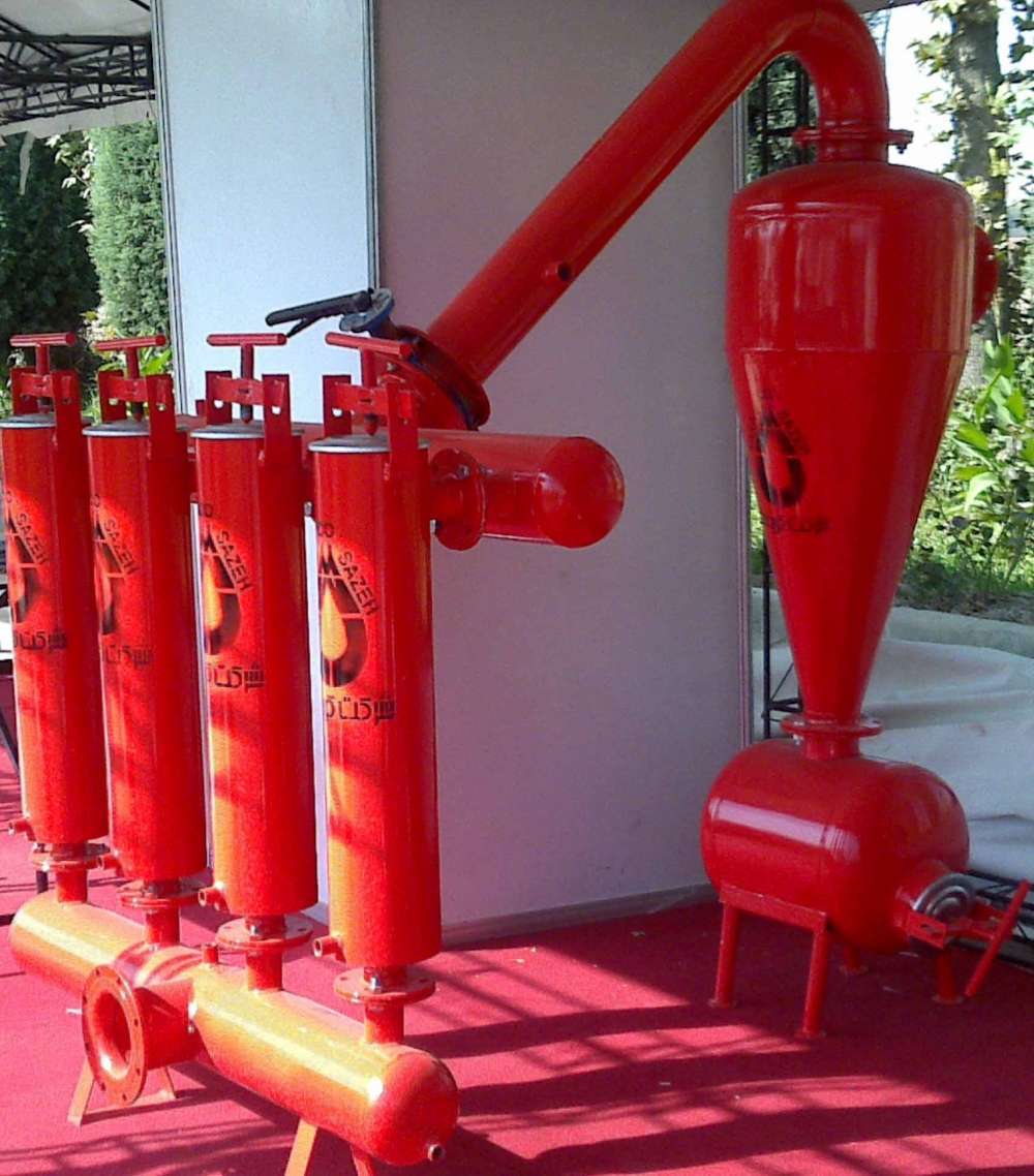 مکانیزم: هیدروسیکلون ها بر مبنای انرژی فشار هیدرولیکی محاسبه، طراحی و تولید می گردند. این انرژی در اثر نیروی گریز از مرکز، سرعت خطی جریان آب خام ورودی به راکتور را به سرعت دورانی با جریان مارپیچی تبدیل نموده که با برخورد ذرات به جداره داخلی و مخروطی دستگاه و تحت نیروی جاذبه در سطح شیبدار و نیروی وزن دانه ها سبب جداسازی ۸۹% ذرات جامد از مایع با حداقل افت فشار می گردد. موارد کاربرد: در سیستم های تصفیه آبهای کشاورزی آبیاری تحت فشار (قطره ای – بارانی- تراوا) و نیز در آبرسانی شهری و منطقه ای با استفاده از منابع آب های سطحی (رودخانه ها و دریاچه ها) از هیدروسیکلون ها استفاده می شود. عمل جداسازی ذرات شن و ماسه با افزایش قطر و فشار وارده به هیدروسیکلون ها بهتر و سریعتر انجام می گیرد. مزایای هیدروسیکلون ها: حداقل افت فشار هیدرولیکی، قیمت پایین و حداقل سرمایه گذاری، عدم نیاز به هواگیری، تعمیر و نگهداری ساده و بهره برداری مطمئن، بازدهی بسیار بالا در حذف ذرات و قابلیت پالایش در آبدهی مختلف – از ۲ مترمکعب در ساعت تا ۳۰۰۰ متر مکعب در ساعت – از جمله مزایای هیدروسیکلون ها می باشد.