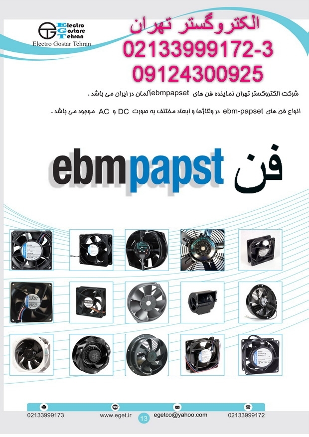 شرکت الکترو گستر تهران وارد کننده و مرکز پخش انواع فن هاي ebm-papst ، فن هاي COMMONWEALTH ، فن هاي , San Ace فن هاي SUNON مي باشد .در صورتي که انواع ديگر فن در برند هاي ديگر مورد نظر شماست و يا جهت اطلاع از قيمت ها با ما تماس بگيريد. جهت دانلود کاتالوگ محصولات به سايت ما به آدرس و http://www.eget.ir مراجعه نماييد. # انواع فن AC: * از سايز 80x80x25 ميلي متر الي 220x220x60 ميلي متر * در ولتاژ هاي 110و 220 و 380 * دو نوع بلبرينگ ساچمه اىBall Bearing و بوشي Sleeve Bearing # انواع فن DC : * از سايز 2.5x2.5x10 ميلي متر الي 170x170x50 ميلي متر * در ولتاژ هاي 12 و 24 و 48