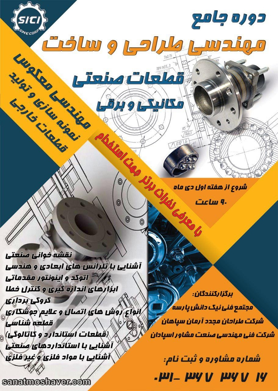 با رویکرد مهندسی معکوس، نمونه سازی، ساخت و تولید قطعات خارجی. مدت دوره: 90 ساعت ویژه قطعات مکانیکی و 78 ساعت ویژه قطعات برقی. شروع از هفته اول دی ماه، همرا با معرفی نفرات برتر جهت استخدام سر فصل ها: نقشه خوانی صنعتی، آشنایی با تلرانس های ابعادی و هندسی، اتوکد و اینونتور مقدماتی، ابزارهای اندازه گیری و کنترل خطا، کروکی برداری، انواع روش های اتصال و علایم جوشکاری، قطعه شناسی (قطعات استاندارد و کاتالوگی)، آشنایی با استانداردهای صنعتی، آشنایی با انتخاب مواد فلزی و غیر فلزی برگزارکنندگان: مجتمع فنی نیک دانش پارسه، شرکت طراحان مجدد آرمان سپاهان، شرکت فنی مهندسی صنعت مشاور اسپادان شماره تماس جهت مشاوره و ثبت نام: 03136736716، www.sanatmoshaver.com