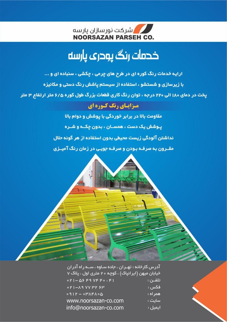 #خدمات رنگ پودری الکترو استاتیک در سه راه آدران ارایه خدمات#رنگ کوره ای #رنگ پودری در طرح های چرمی ، چکشی ،سنباده ای و ... با زیرسازی و شستشو ، استفاده از سیستم پاشش رنگ دستی و مکانیزه ،پخت در دمای 180 الی 220 درجه #مزایای رنگ کوره ای مقاومت بالا در برابر خوردگی با پوشش و دوام بالا پوشش یک دست ، همسان ، بدون چکه و شره نداشتن آلودگی زیست محیطی بدون استفاده از هرگونه حلال مقرون به صرفه بودن و صرفه جویی در زمان رنگ آمیزی شرکت نورسازان پارسه آماده ارایه خدمات رنگ پودری الکترواستاتیک به ارگان ها و شرکت ها و تولید کنندگان محترم میباشد