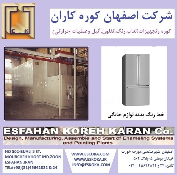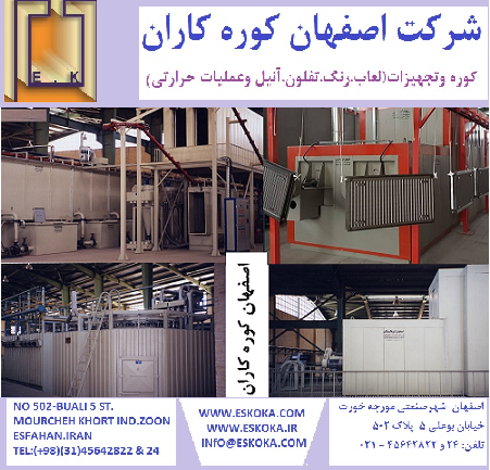 شرکت اصفهان کوره کاران با مدیریت آقای دکتر فریبرز مسعودی با سابقه ای درخشان بخصوص در کارخانجات لوازم خانگی در زمینه های بشرح زیرآماده ارائه خدمات است: کوره وتجهیزات رنگ(پودری - مایع) کوره و تجهیزات لعاب فلز کوره و تجهیزات رنگ استاتیک کوره وتجهیزات الکترواستاتیک کوره وتجهیزات عملیات حرارتی ( آنیلینگ) کوره وتجهیزات خط تفلون کوره و تجهیزات الکتروفورز تونل های شستشو انواع کانویر کابین های پاشش رنگ و لعاب سایکلونهای جمع آوری پودر رنگ سایکلونهای جمع آوری گرد وغبار آسیاب های لعاب