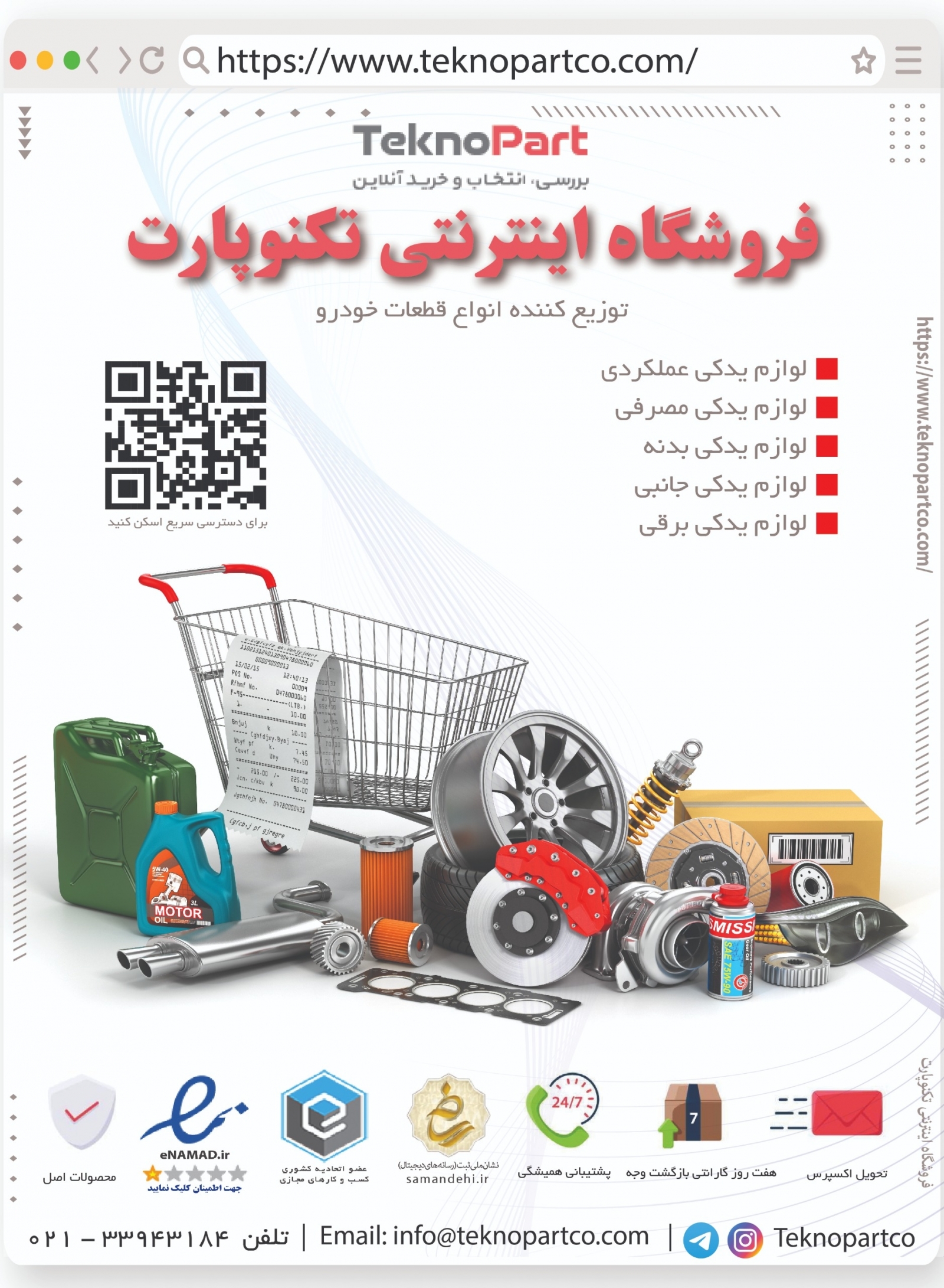 لوازم یدکی برقی نظیر سنسور اکسیژن، سنسور هوا، سنسور منیفولد، کویل و کلید بالابر لوازم یدکی سیستم سوخت رسانی مثل سوزن انژکتور، ریل انژکتور، پمپ بنزین و صافی بنزین لوازم یدکی موتوری اعم از میل لنگ، شاتون، رینگ، پیستون، دسته موتور و شمع لوازم یدکی گیربکس مانند گیربکس کامل، ساعتی گیربکس و کارتل گیربکس لوازم یدکی هیدرولیک شامل پمپ، تسمه، شلنگ و لوله هیدرولیک لوازم یدکی سیستم تعلیق اعم از میل موج گیر، طبق، سیبک، کمک فنر، اکسل، رام، سگ دست و بلبرینگ قطعات بدنه مثل سپر، رکاب، درب عقب و جلو، درب موتور ، درب صندوق، جلو پنجره و سینی
